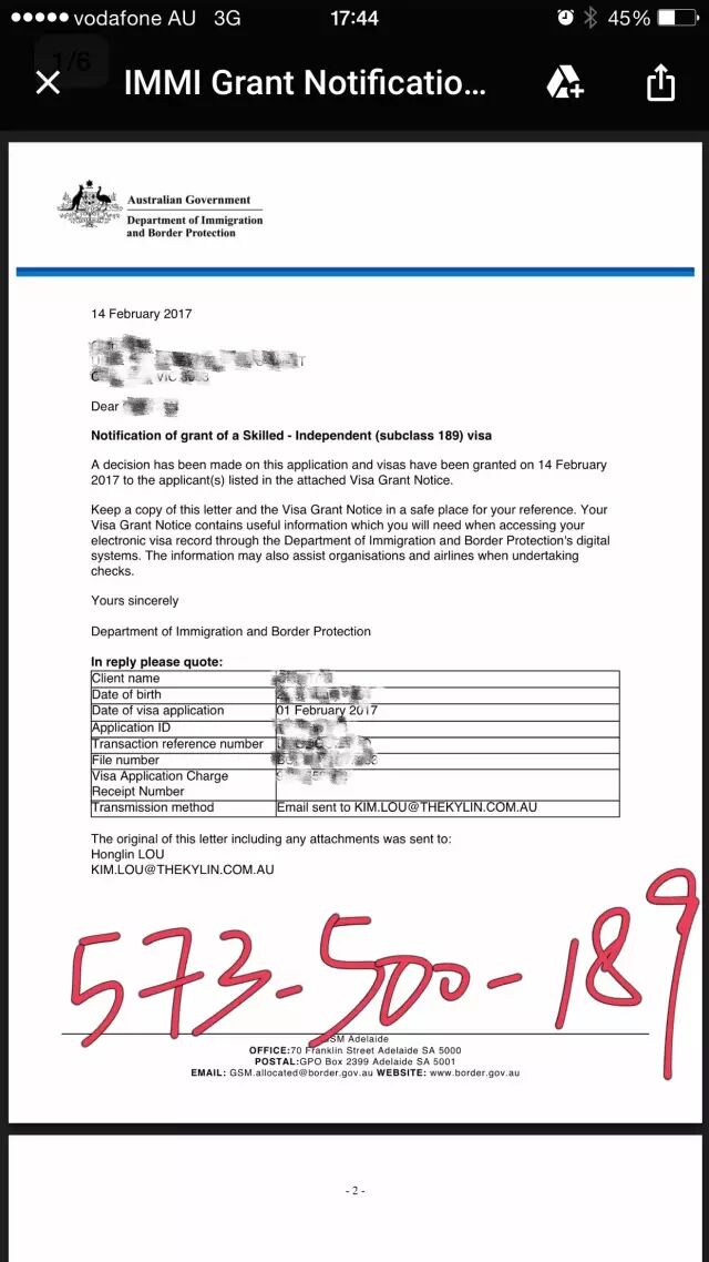 在2017年1月20日成功升级65分EOI以后, 接着便获得邀请当日我们帮助客户2月1日递交了签证,2月14日获批!